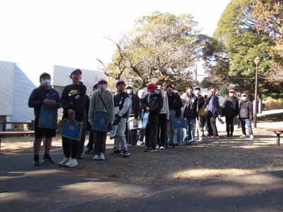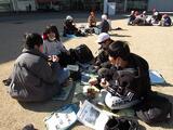 日立市役所では、晴天の空の下、大屋根広場にシートを敷き、お弁当をみんなで楽しく食べました。