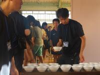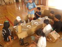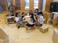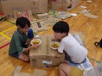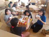 オッズ塾。まずは昨日の夕方からの報告です。プールの後はお腹もすっかりぺこぺこになりました。夕飯はカレーライスです。みなさんは各部屋の中に設置した、手作り段ボールテーブルの上にお皿を並べ、おいしくいただきました。