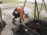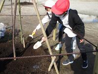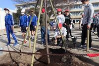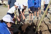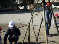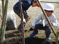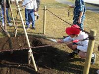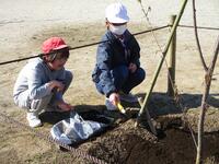記念植樹を今日行ったのは、1、2年生です。「大きくなってね」と口々に言いながら、丁寧に土をかぶせていました。成長が楽しみです。