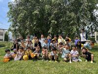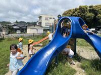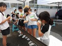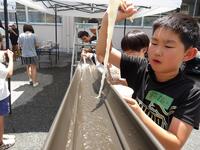 お昼は、雨樋を使った流しそうめんです。時折流れるカニカマを、みんなでねらい取りしました。