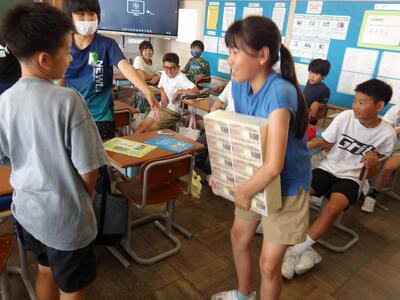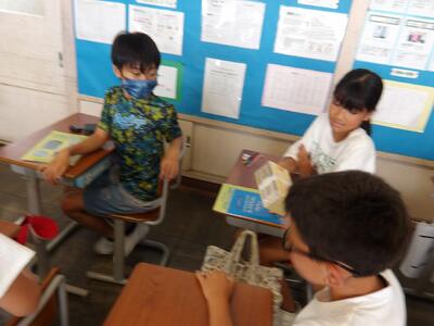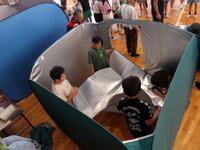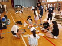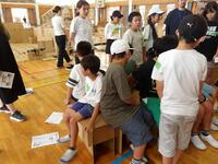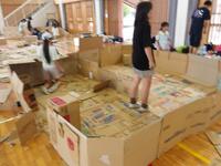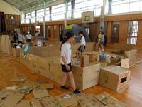 午前中は、体育館で段ボール工作大会や防災講習会がありました。6つのグループに分かれ、体育館いっぱいに段ボールを広げながら協力してつくりました。